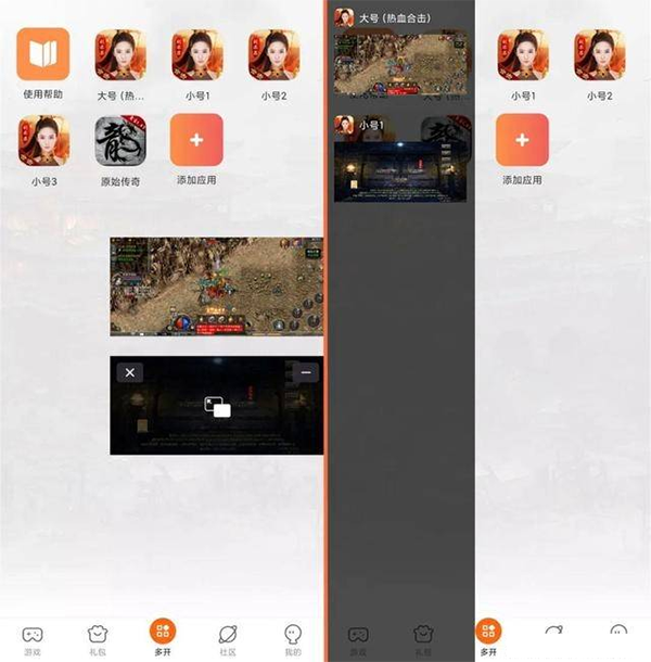6、多开管理:需要开启其他应用的话,可以直接退回桌面,已经开启的应用就会以小浮窗的形式出现在手机上,重复添加应用、开启应用即可完成多个游戏/应用的多开。小浮窗内有最小化和全屏按钮,点击【X】即可关闭已经多开的应用,点击【-】可以最小化到侧边栏,点击中间【口】方框可以回到全屏画面。