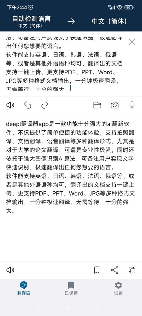 DeepL官方版是一款功能强大的手机翻译工具app,支持多种语言,如图片、文档等都可以智能识别,体积极小,打开就能随时开始翻译。操作简单易上手,没有任何繁琐的流程,不同语种之间都能相互翻译,与原文的意思一致性极高,十分准确。可以帮助大家收集文本中的单词、句子,随时都能在线复习,练习发音,有效提升用户的语言水平,无障碍的与外国友人交流。