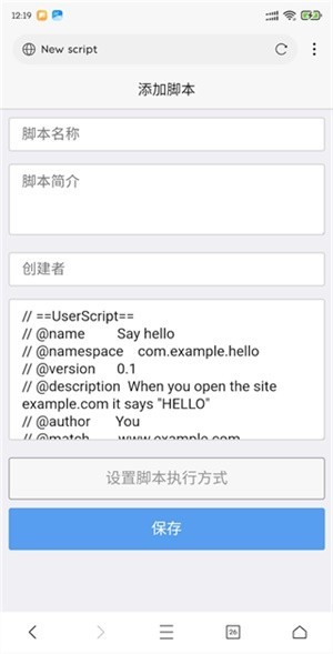 然后,把把代码粘贴至“JavaScript代码”编辑区域点击保存即可。对于符合规范的油猴脚本,无需填写“脚本名称”、“脚本简介”等字段,浏览器会自动从元数据中提取这些信息保存。