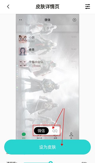 同样在壁纸界面,点击下方的应用皮肤即可开始设置,可以选择设置微信皮肤还是QQ皮肤,选择完之后可以点击下方的“设为皮肤”就可以完成应用皮肤的设置啦。