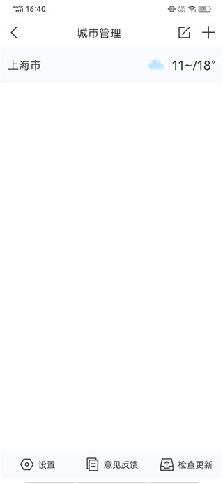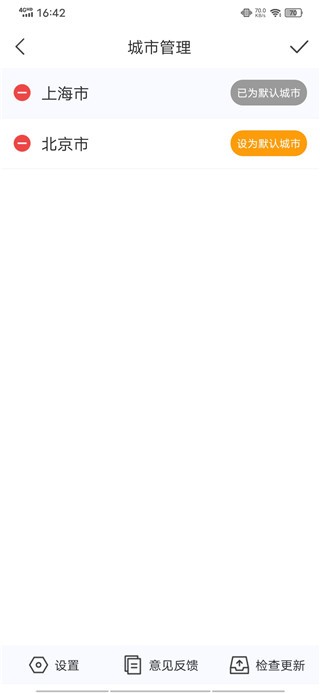 4、添加完后,在城市管理中点击+号旁的修改,可以进行默认城市的设定,这样下次进入app后就是直接现实默认城市了。