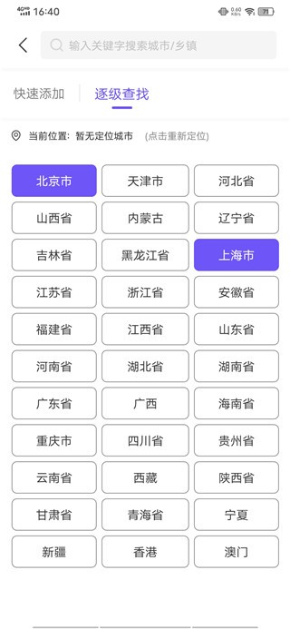 3、进入后用户可以选择打开定位功能,让app自动定位你所在的城市,也可以选择输入地区手动添加。