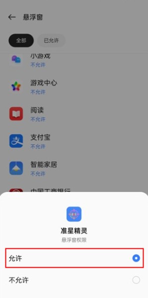 2、有些手机会提示没有获取到悬浮窗权限,根据提示打开准星精灵的悬浮窗权限即可。