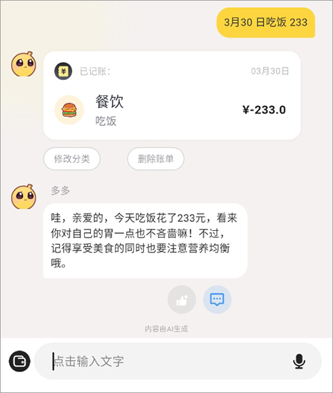 可输入具体的月日加上记账内容进行记账。示例:“3月30 日吃饭 233”,“7月 23 日买花 32”