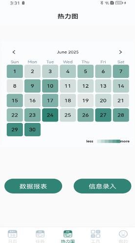 4. 热力图 : 支持自定义类型热力图,观察时间内数据变化,可做血压的管理,运动步数、工资的管理等,还可以添加每天的心情表情哦,还可以生成线性统计图表,并一键导出报表;