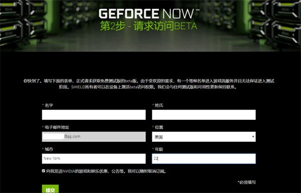 4、输入申请信息,由于目前测试只支持北美和欧洲,所以位置和城市需要满足上述要求,如下图演示。