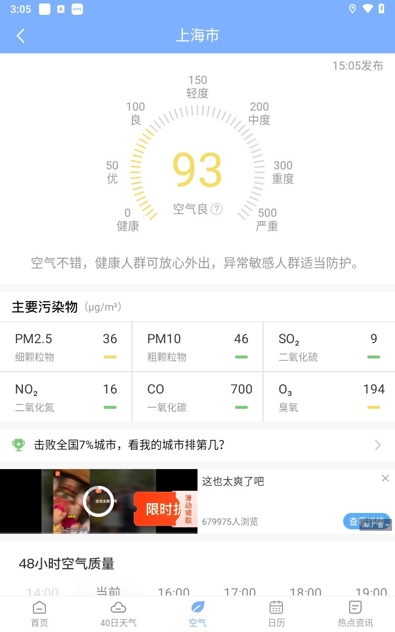 4、空气界面可以查看当日空气质量
