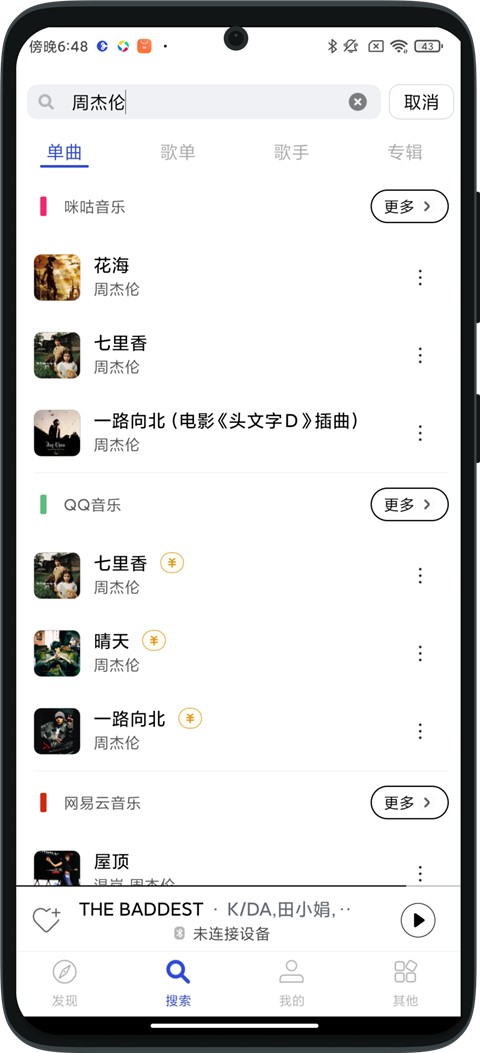 在发条内可以直接搜索到包括QQ音乐、网易云音乐、咪咕、酷狗、酷我、Spotify和Apple Music等七个平台的歌曲(iOS目前因为还在内测,只有QQ、网易云和AM)。只需要一个App,基本上可以搜到你想找到的全部歌曲。