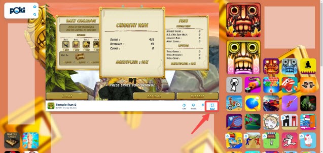 3、因为是在线游戏,所以游戏内容需要时间加载,加载所需时间会根据网络情况、网速不同而不同。加载完,游戏界面会出现提示怎么开始游戏,比如下图的神庙逃亡2“press space to play”(按空格来开始游戏)