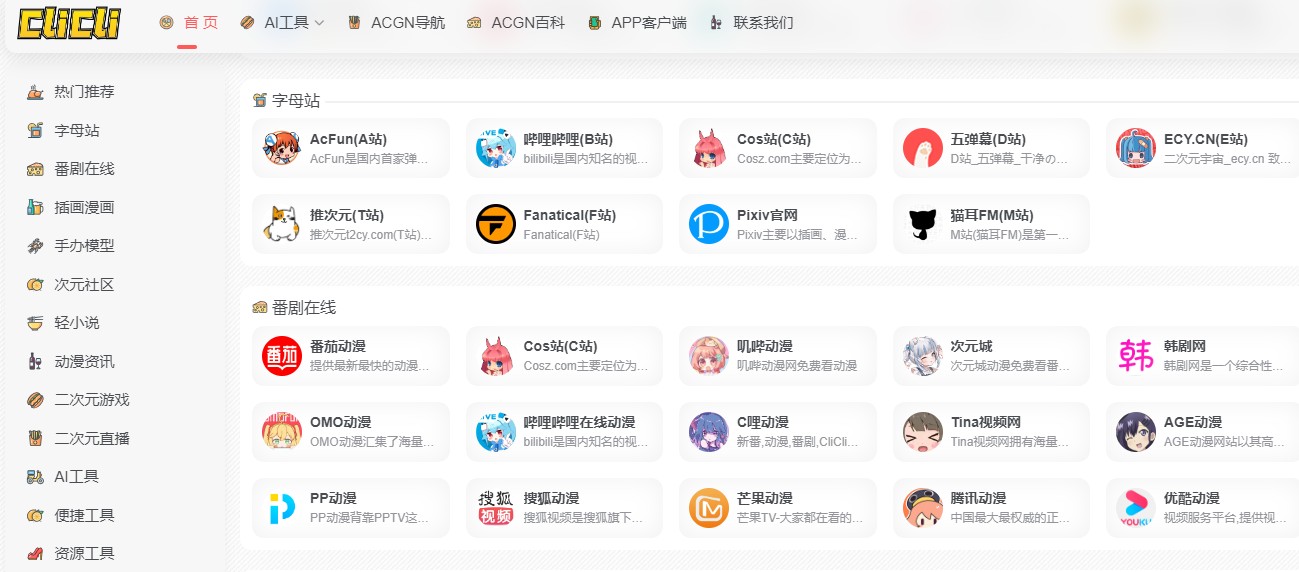 呲哩呲哩CliCli-收录了数千二次元优质站点,包含免费看番,二次元社区,二次元小说,二次元游戏,手办周边,二次元直播等,并且只收录长期运营且稳定安全的网站,尽情的畅游二次元世界吧!