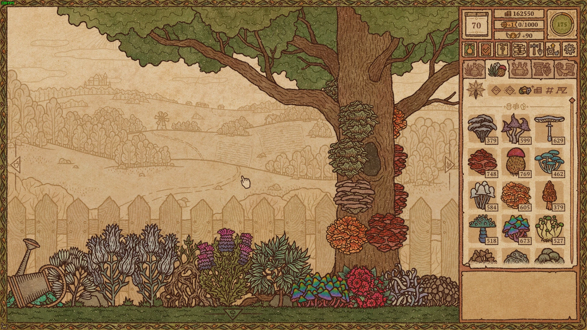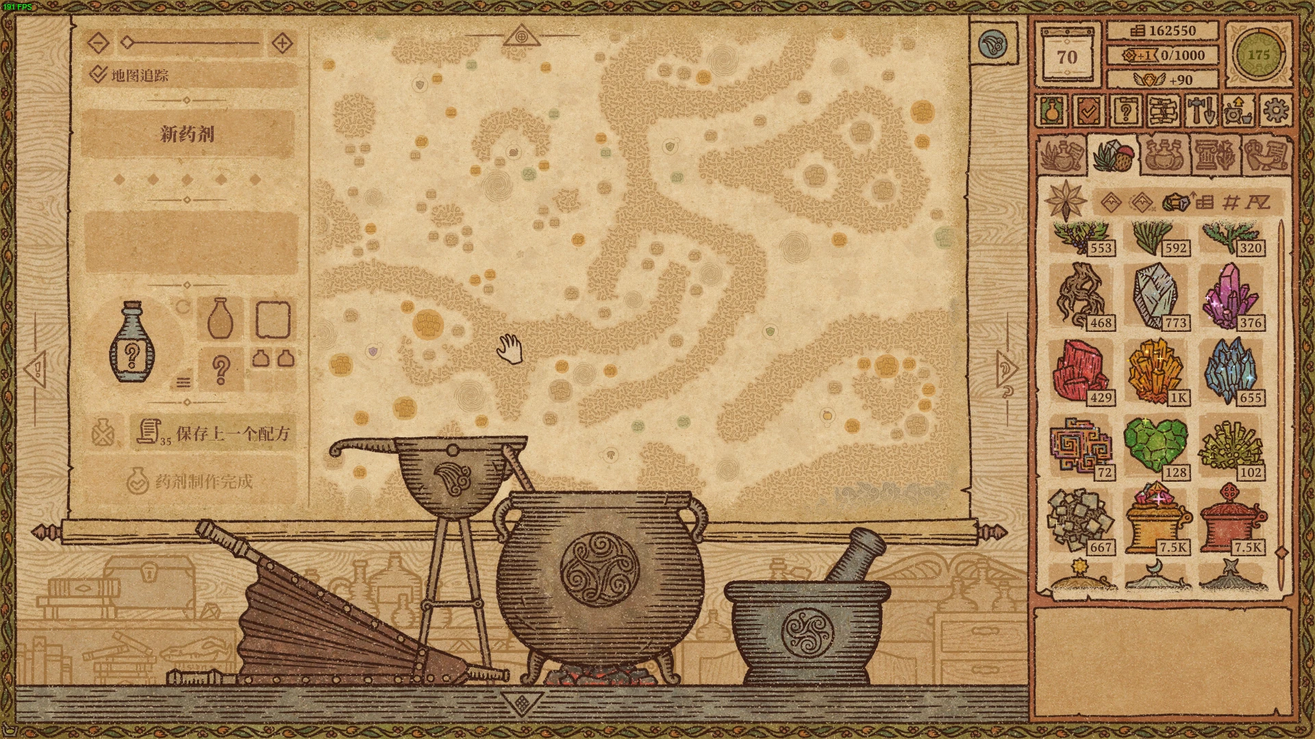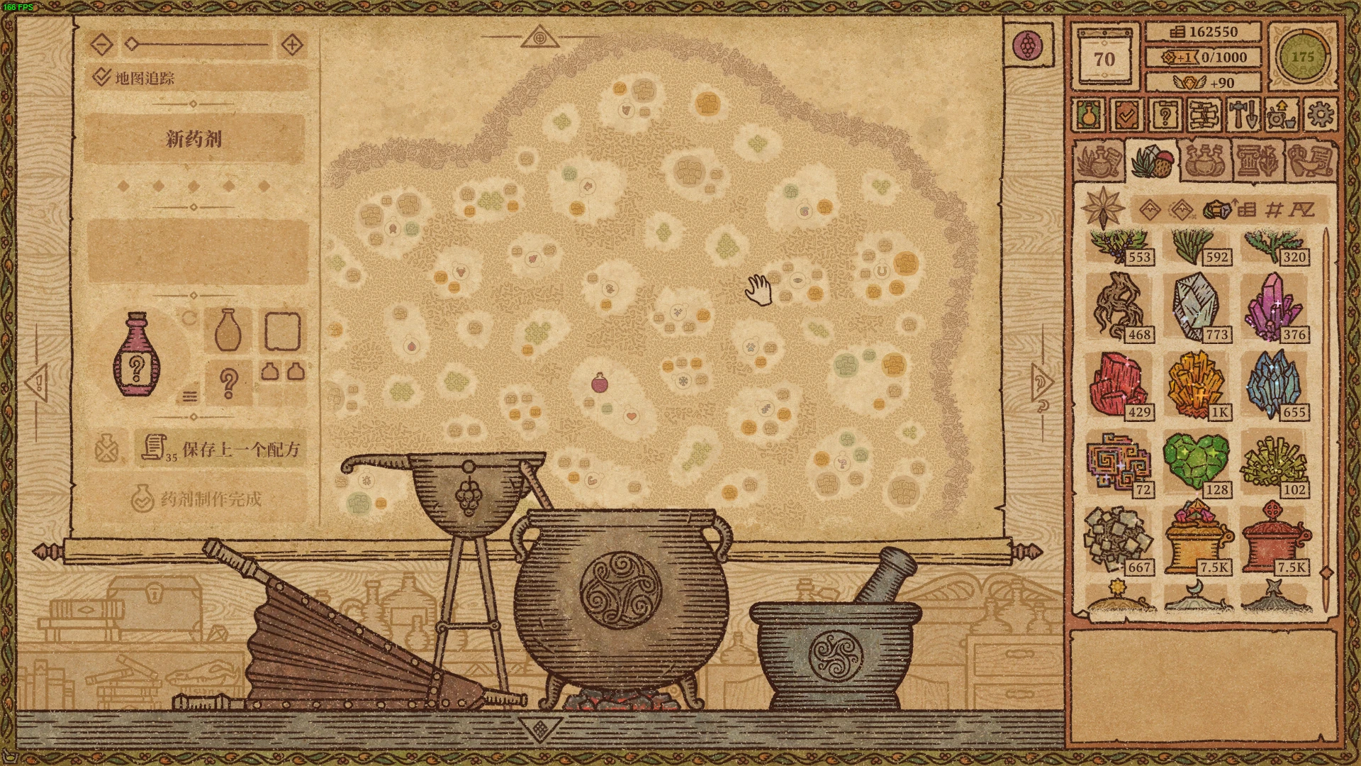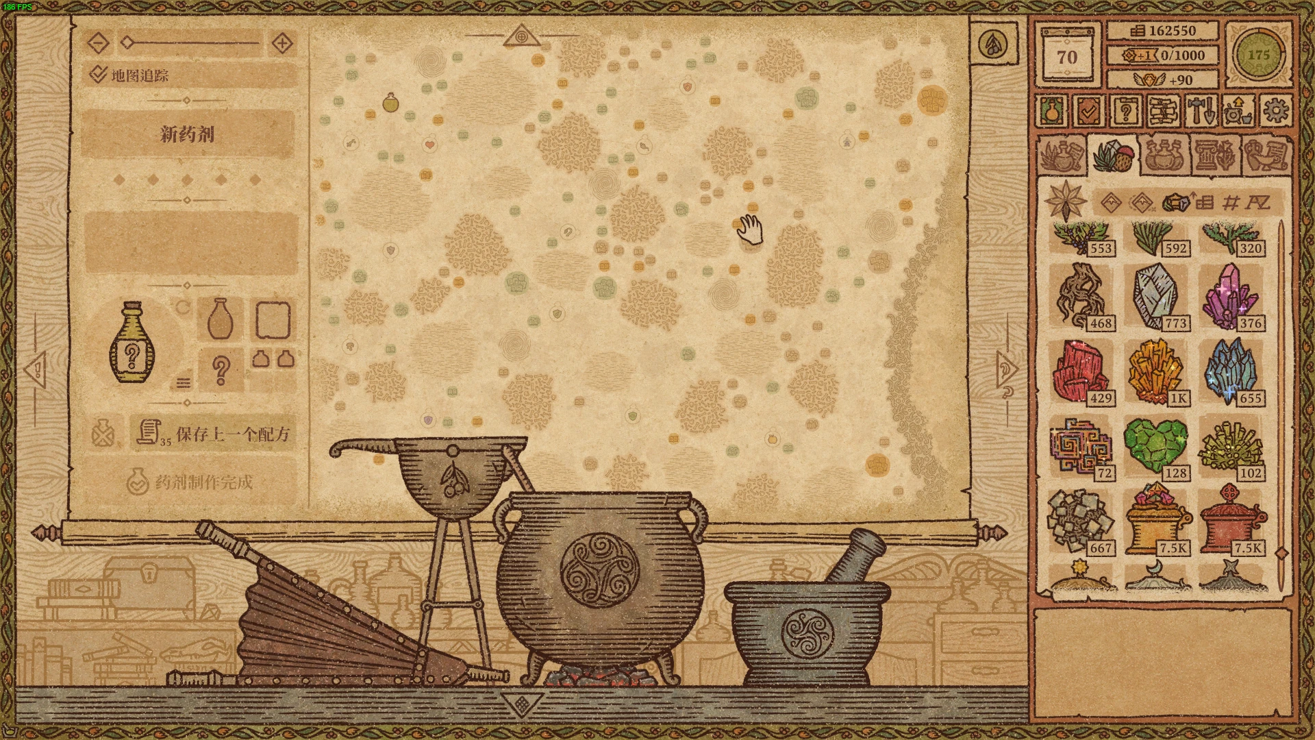 游戏共有三种原料,分别是草药、蘑菇和水晶,水晶出现在后期,是制作传说配方最重要的原料。这三种原料都可以在魔法树附近进行种植,相应的种子会出现在每天随机刷新的访客商人身上。