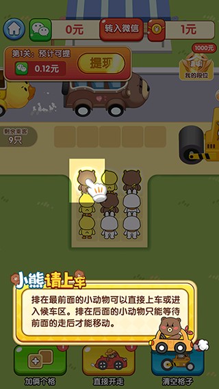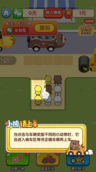 小熊请上车红包版是一款采用了优秀的卡通风格进行打造的休闲益智游戏哦,玩家们需要在这里通过自己的智慧让各种不同的小熊进入到对应色彩的车辆上面。很多不一样的操作都是非常简单的,并且游戏里面加入了很多好玩的关卡内容,各个关卡都是会有自己的难点!