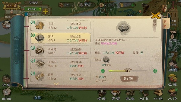 ②点开右下角【材料】,可以手动生成二级材料【石块】,【木块】,【麻布】,【麻绳】