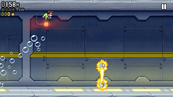 【优点】:这样做既可以收集最多的金币,又可以有效避开电火链。因为电火链会出现在屏幕的任何位置,如果Barry飞在顶空或者在陆地奔跑,他可以改变的位置就很小,这样遇到前方电火链来不及起飞或下落。