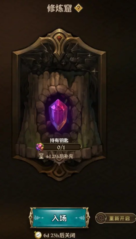 进入修炼洞窟需要“修炼窟钥匙”,使用钥匙开启后,此玩法将开放7日。7日后,无论您是否通关,该副本都将进行重置。若7日内您通关副本,则修炼洞窟将被关闭并重置,您将无法再次进入。