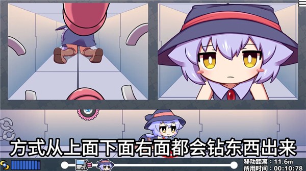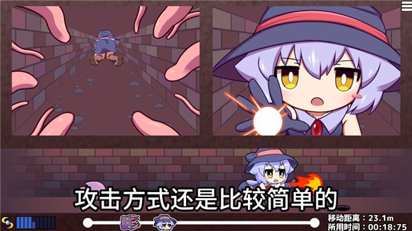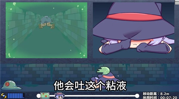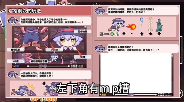 2、进入游戏之后会有一个窄窄洞穴的玩法提示,背景就是你在探险途中不小心误入了窄小的地牢左侧有怪物头目追来,得在被他追上之前从这里脱身!怪物头目的位置,游戏暂停按钮,主人公小莉拉,怪物地址,MP槽,移动距离指示器,魔法突围等技能都标注出来了,一旦被敌人打中你就会摔倒可以使用起立或蹲下避开敌人,情况不对就用擅长的魔法突围,上加攻击就是冰钻,左加攻击就是雷电,下加攻击就是竹笋首次进入游戏可以看一下操作提示。