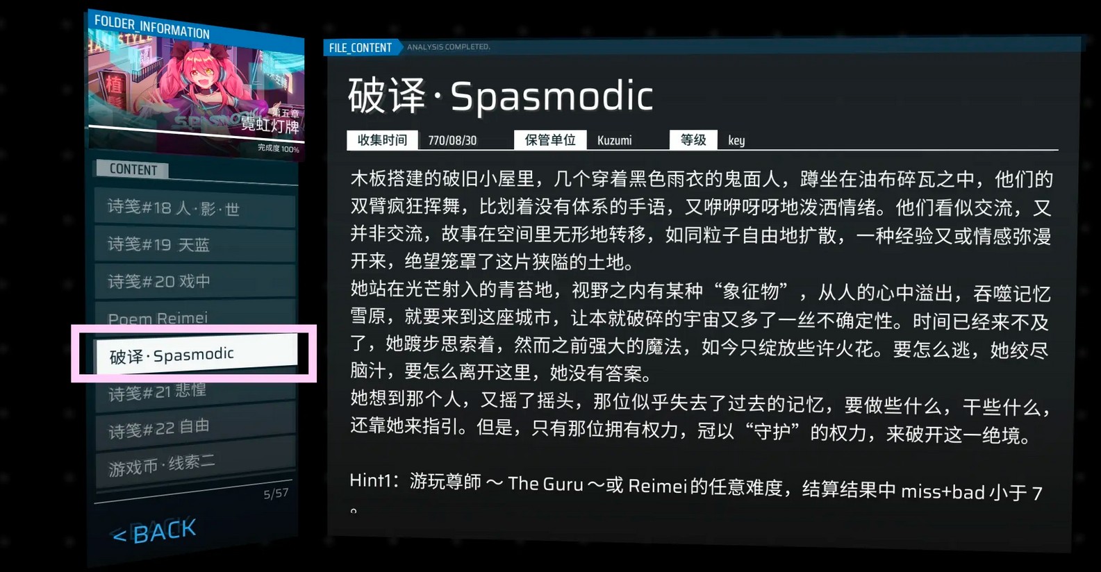 「破译·Spasmodic」只能通过游玩「尊師~The Guru~」掉落且首次游玩必定掉落,旨在帮助玩家解禁魔王曲