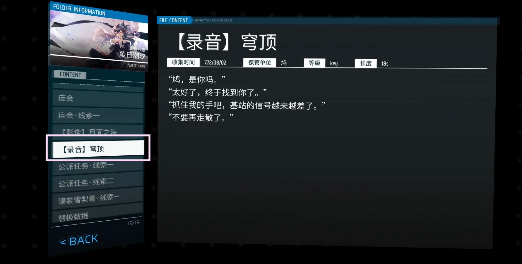 注:第一章由于“冰封层”发生了“巴别事件”导致覆灭,所以被收录至「过去的章节」,请您进入该章节并将您的曲目排列顺序调整为「默认」以方便寻找曲目(调整为默认后章节曲目会变成相邻的),第一章共包含5首曲目,它们分别是↓
