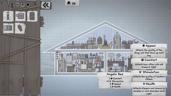 ●每只猫会降低房间舒适度1点,每个房间的粪便也会降低该数值1点。