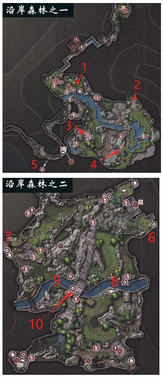 下图即为10位猎鬼者的位置分布,该地图分为上下两个部分,上半张和下半张分别分布着五位猎鬼者,按照顺序即可完整找出所有猎鬼者:
