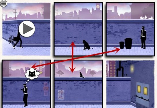 这关稍微增加了难度了,先把第一第三画面对换,让人物从画面二翻墙过去。