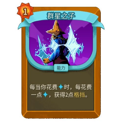 【强度解析】是角色唯一可用的能力防卡牌。其余同类能力防均有致命缺陷:招架设计完全失败、创世之柱无有效配合卡、王之凝视费用设计不合理。群星之子自身数值充足,单张「群星之子 +」即可满足常规防御需求,重复抓取可稳定支撑龟壳防体系。