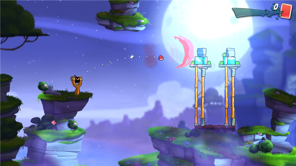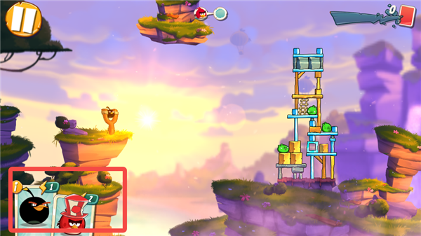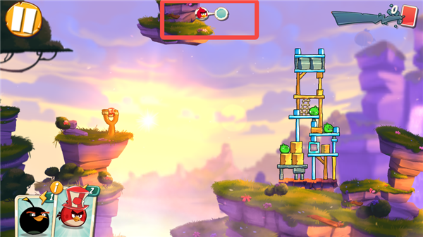 1、进入愤怒的小鸟2游戏最新版,进入关卡,玩家需要拖动左边弹弓,将小鸟弹射击中右边的猪。