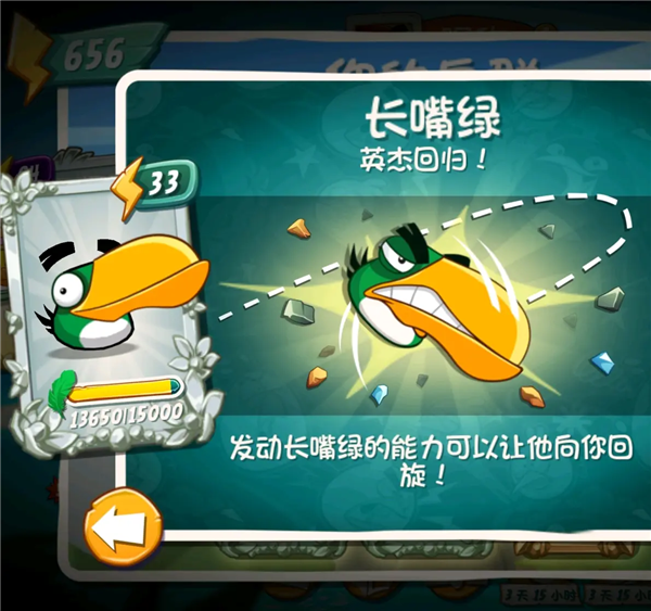 发动长嘴绿的能力可以让他向你回旋!点击后向下小幅度拐弯后回旋,回旋力度很大,比一般鸟初始射程大一点点。可碰撞后再触发技能。
