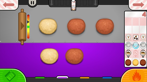 3、接下来到后厨区,我们需要先用擀面杖将面团擀成面饼,当指针到达绿色时点击,多订单时可以放置多个面团同时完成。