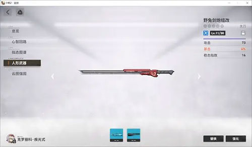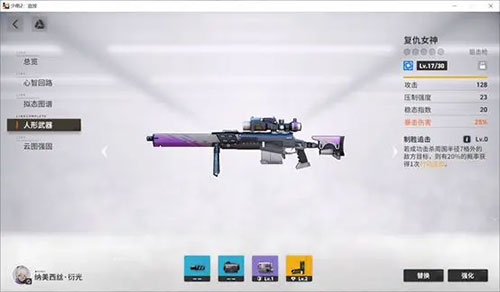 人形武器分为两类,分别是动能武器,对应硬质护甲;以及离子武器,对应离子涂层。每种武器仅能由对应职业装备,角色的技能属性直接由武器属性决定,强化武器可提高攻击力,武器满级后可持本体突破,增加等级上限和增加武器被动技能。金色武器拥有专属被动技能,同时拥有所有配件格(不同金色武器配件数量不同),紫色武器拥有半数配件格。紫色或金色配件拥有被动词条。