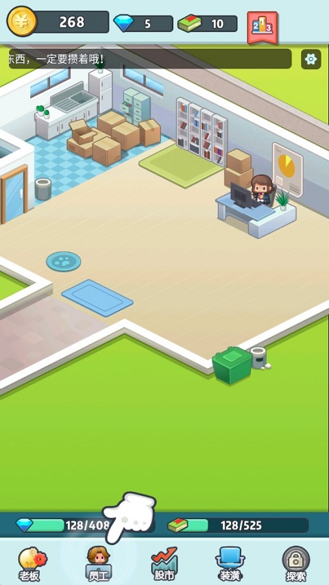 1、作为公司老板,首要学会的便是赚钱能力,基于这款游戏的简单玩法,玩家可以通过快速点击屏幕来获取收益。