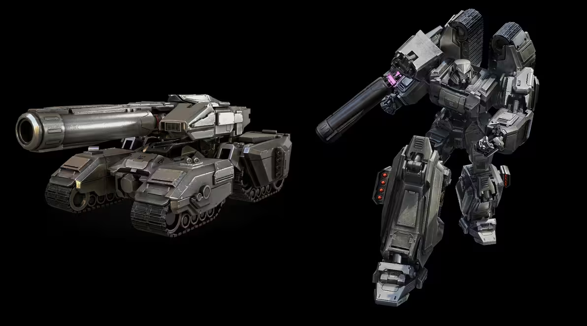 载具形态(4人载具):紫色重装坦克,拥有移动堡垒级防御和重复激活利用的机制。支持移动或原地变身,并可使用蓄力电磁炮技能。