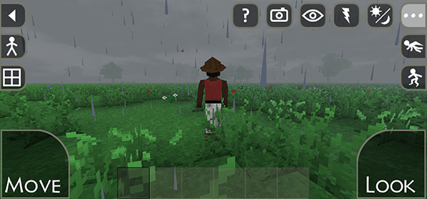 7、右上角的功能按钮可以控制角色的视角和场景的天气等。在地图中,你的目标是努力生存下去。