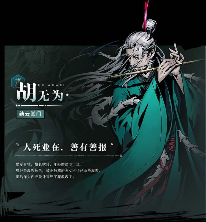 酷爱音律,擅长吹箫,年轻时结交广泛。曾经是魔教长老,被正教威胁妻女不得已背叛魔教,随后作为内应设计害死了魔教教主。