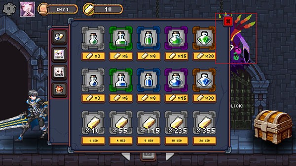 1、进入游戏后,点击右上方的漂浮魔怪,可以购买各种药剂、角色和礼品,这里相当于游戏的商店;