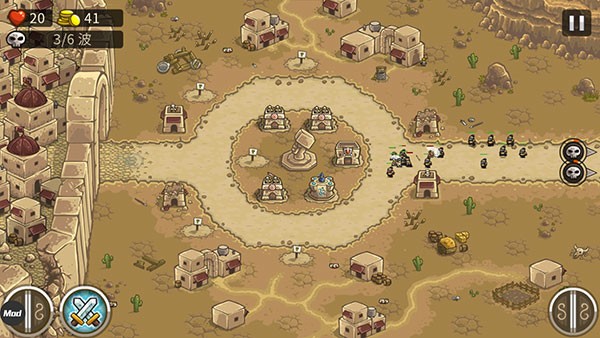 攻略:本关的重点在于死守中央路口,初始布局建议左侧弓箭塔,魔法塔;中下部弓箭塔,炸弹塔;右侧弓箭塔;中部步兵塔,弓箭塔(参考图片一)。有资金后在中部补充1座弓箭塔,1座步兵塔以稳固中央防守,增援还是冷却就用。然后升级,本关的塔可以升1级,优先升级中央的步兵塔,然后是左侧的魔法塔,再后是中央的弓箭塔和中下的炸弹塔。本关二级沙漠兵较多,在其于中央集中时用火雨。后期可酌情在后方补箭塔,总的来说本关难度不大,我通关时还有600多金
