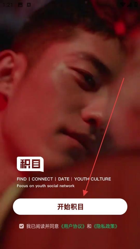 1、打开积目交友,在初始页面勾选已阅读并同意协议,点击开始积目,进入应用主界面。