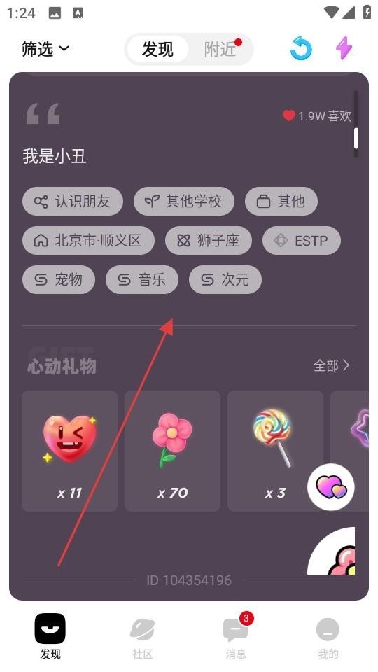 3、切换至发现页面,查看用户发布的动态,了解其个人标签、心动礼物等信息,参与互动。