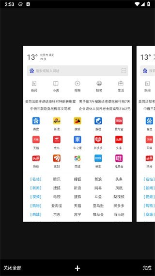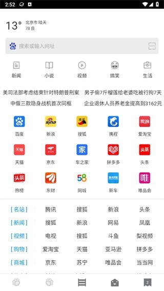 1、打开软件在首页中可以搜索网址,还有新闻、小说、视频等服务;