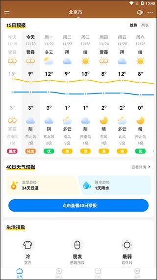 4、点击右上角的趋势按钮,还能非常直观地看到一周15天天气的趋势变化。