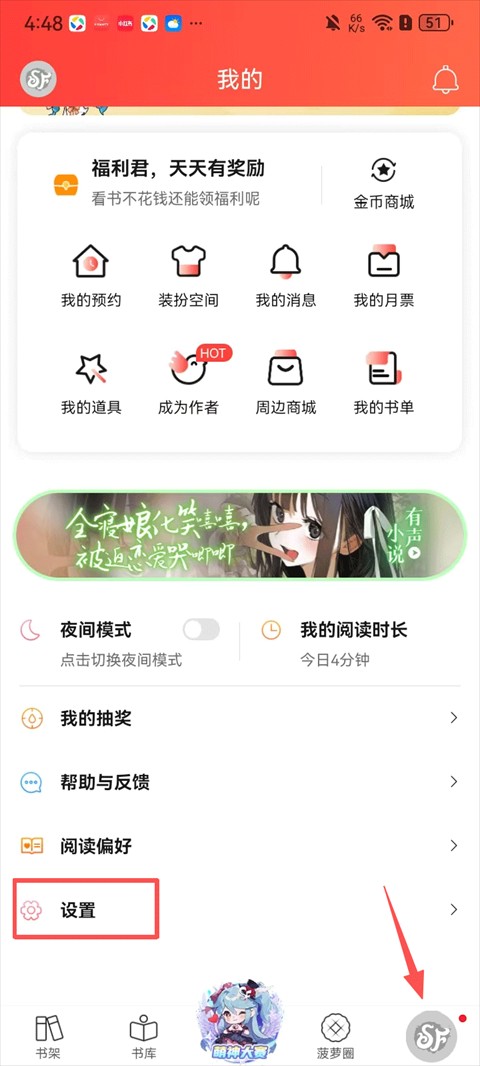 1、打开菠萝包轻小说2026最新版软件,进入首页后点击界面左下角【书架】选项